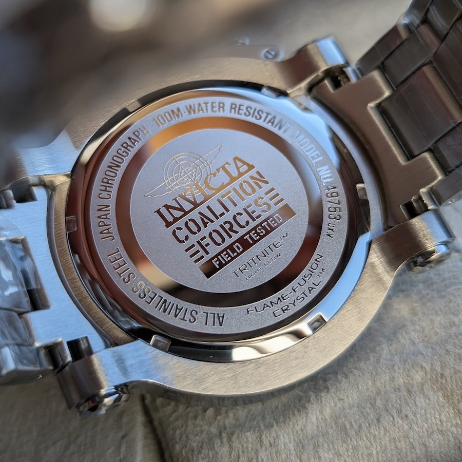 Годинник Invicta Coalition Forces 49753 – це хронограф у масивному корпусі з нержавіючої сталі діаметром 52 мм. Його циферблат виготовлено з перламутру, він має накладні мітки годин, а також вікно дати яке розташоване між 4 та 5 годинами.