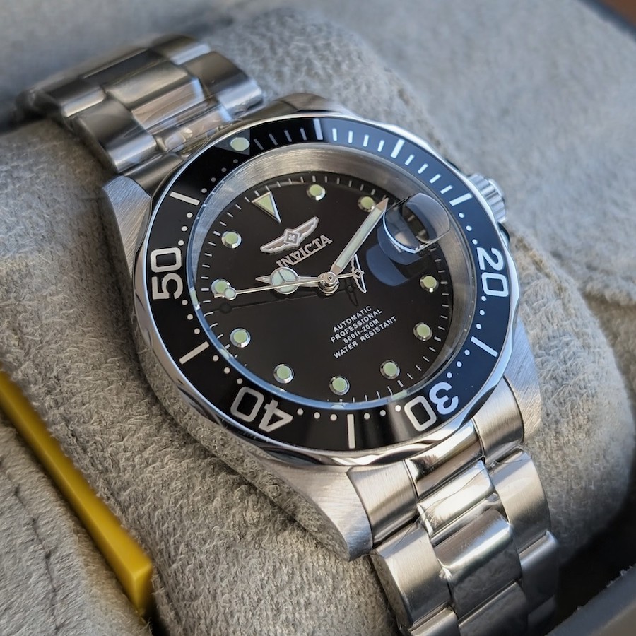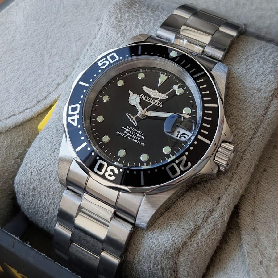 Механічний годинник Invicta Pro Diver 17039 має корпус із нержавіючої сталі діаметром 40 мм. Циферблат металевий, чорного кольору з накладними мітками годин. Хвилинна шкала нанесена по зовнішньому радіусу циферблата. Календар розташовано на 3й годині під збільшуючим склом. Стрілки та мітки вкриті люмінесцентним складом. Сталевий поворотний безель з чорним кільцем. Загвинчуюча заводна головка.