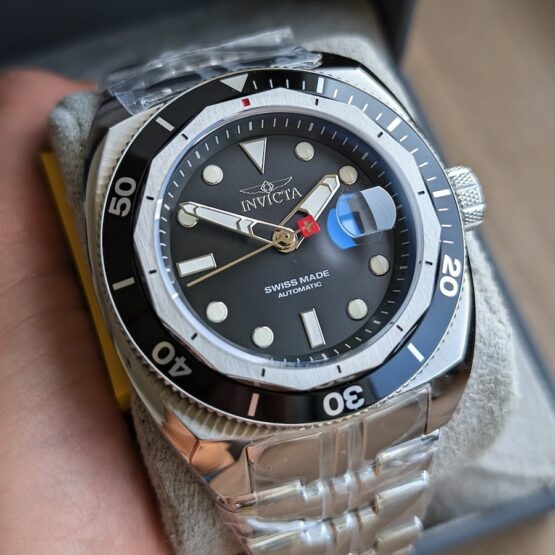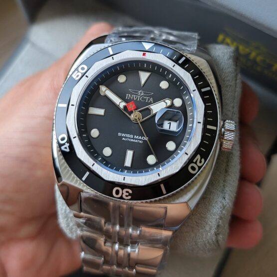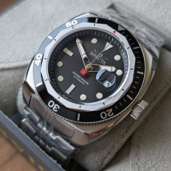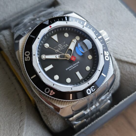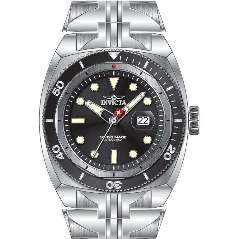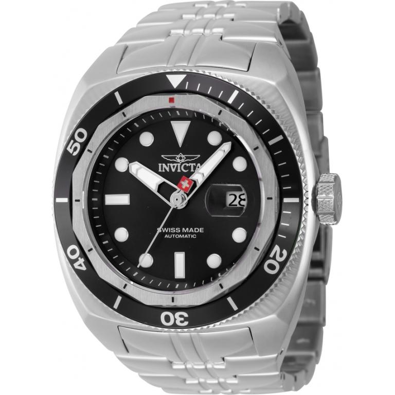 Invicta Swiss Made 44750 — це швейцарський механічний годинник із автопідзаводом, створений для поціновувачів потужного дизайну та бездоганної якості. Модель вирізняється масивним корпусом із нержавіючої сталі діаметром 52 мм і чорним металевим циферблатом із накладними індексами. Вікно дати на позначці 3 години під збільшуючим склом, а люмінесцентні стрілки та мітки забезпечують чудову читабельність при низькій освітленості.